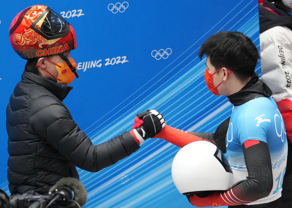 2月11日,閆文港(右)在國家雪車雪橇中心舉行的北京2022年冬奧會(huì)男子鋼架雪車比賽后和隊(duì)友殷正握手。新華社記者孫非攝