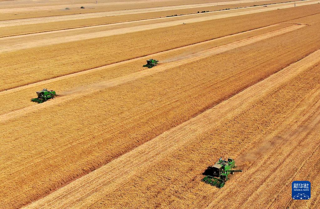 在河南省黃泛區(qū)農(nóng)場(chǎng)九分場(chǎng)的麥田里,農(nóng)機(jī)手操作收割機(jī)收獲小麥(無人機(jī)照片,2021年6月6日攝)。新華社記者 李安 攝
