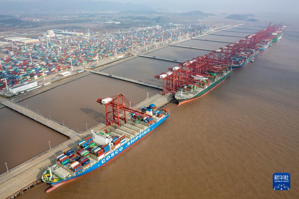 浙江寧波舟山港梅山港區(qū)集裝箱碼頭一派繁忙景象(2021年12月17日攝,無人機(jī)照片)。新華社發(fā)(蔣曉東 攝)