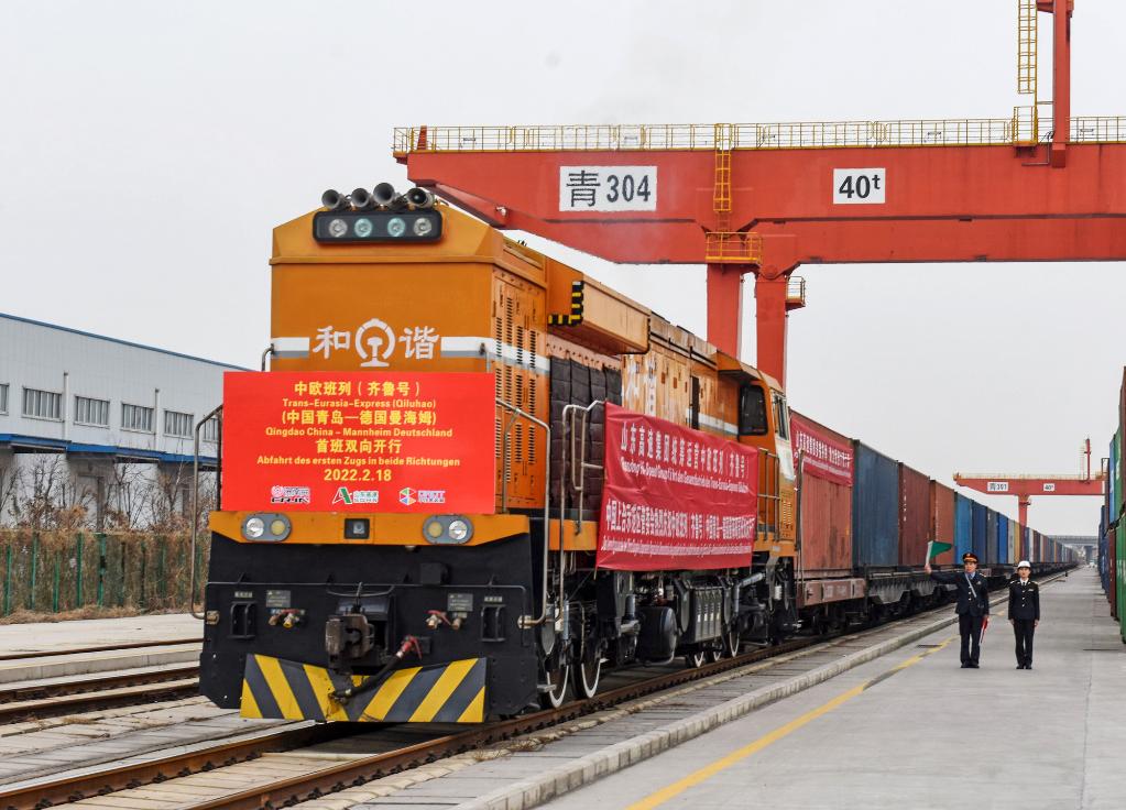 2月18日,中歐班列(齊魯號)中國青島—德國曼海姆雙向對開首班列車從上合示范區(qū)青島多式聯(lián)運中心出發(fā)。(新華社發(fā),王昭脈攝)