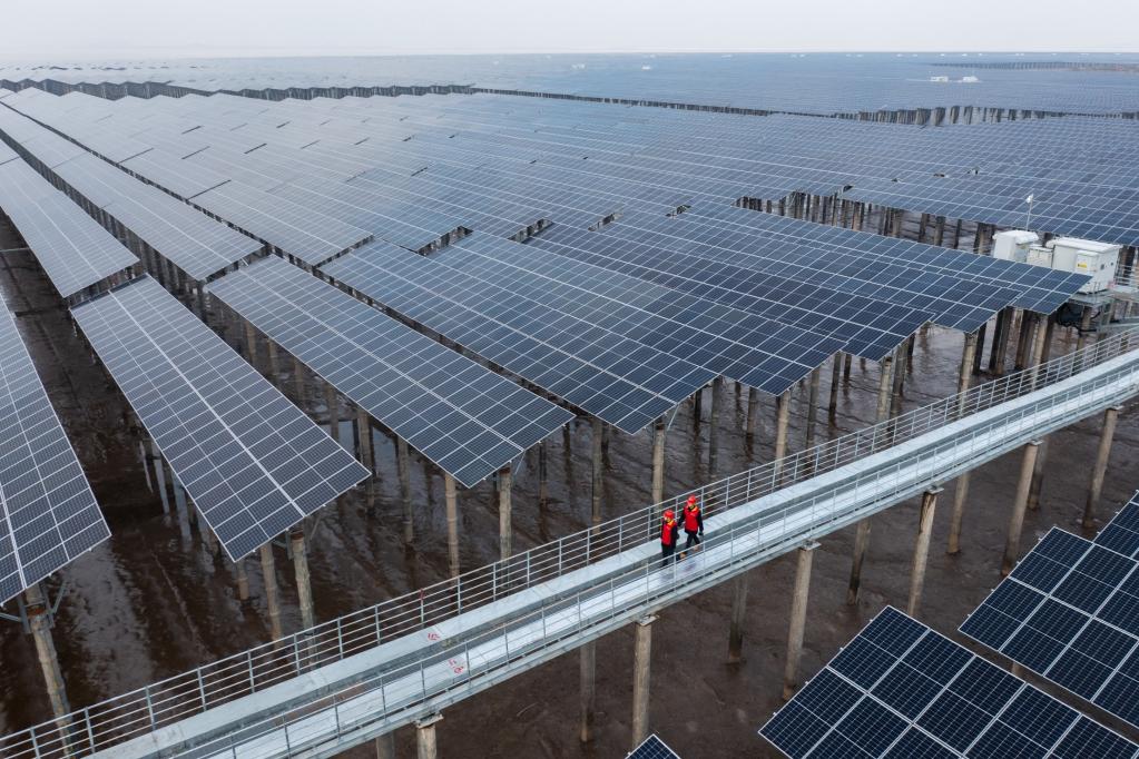 圖為2021年12月29日拍攝的浙江省寧波市象山縣長大涂灘涂光伏項目(無人機照片)。(新華社記者徐昱攝)
