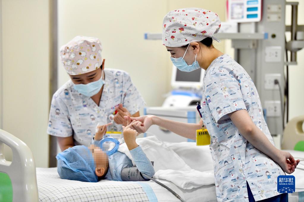 在山東省棗莊市婦幼保健院兒童ICU病房,醫(yī)護人員為完成靶向治療藥物諾西那生鈉的4歲脊髓性肌萎縮癥患兒加油鼓勁(1月1日攝)。諾西那生鈉注射液是我國首個獲批治療脊髓性肌萎縮癥的進口藥物,2019年進入中國市場時,每針價格近70萬元。在2021年國家醫(yī)保目錄藥品談判中,以3.3萬元每針的價格進入新版醫(yī)保藥品目錄。新華社記者 郭緒雷 攝