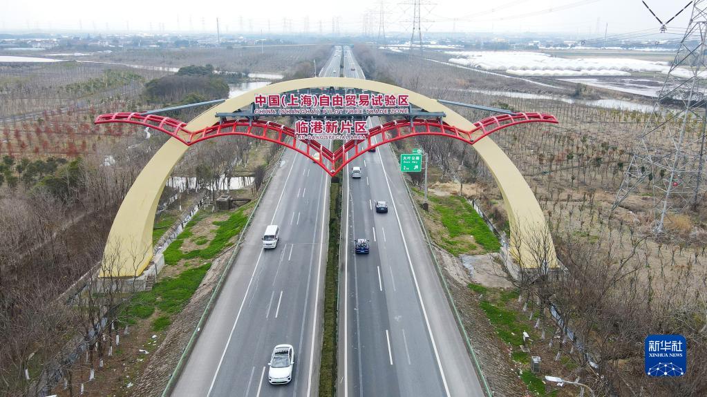S2滬蘆高速上的中國(上海)自由貿易試驗區(qū)臨港新片區(qū)“海鷗門”(2月10日攝,無人機照片)。新華社記者 方喆 攝