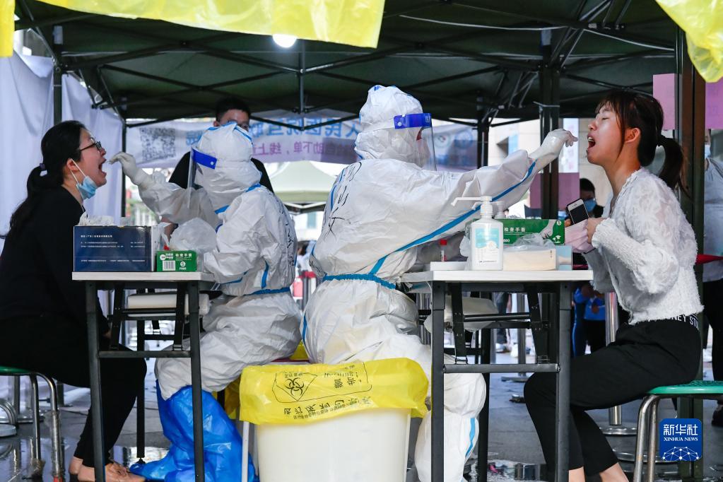 3月13日,在深圳羅湖區(qū)向西村核酸檢測點(diǎn),醫(yī)務(wù)人員為居民進(jìn)行核酸采樣。新華社發(fā)(儲(chǔ)焱攝)