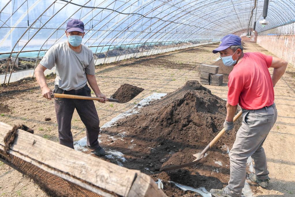 4月15日,在吉林省吉林市龍?zhí)秴^(qū)江北鄉(xiāng)棋盤(pán)村,農(nóng)民在大棚內(nèi)忙碌。新華社記者張楠 攝