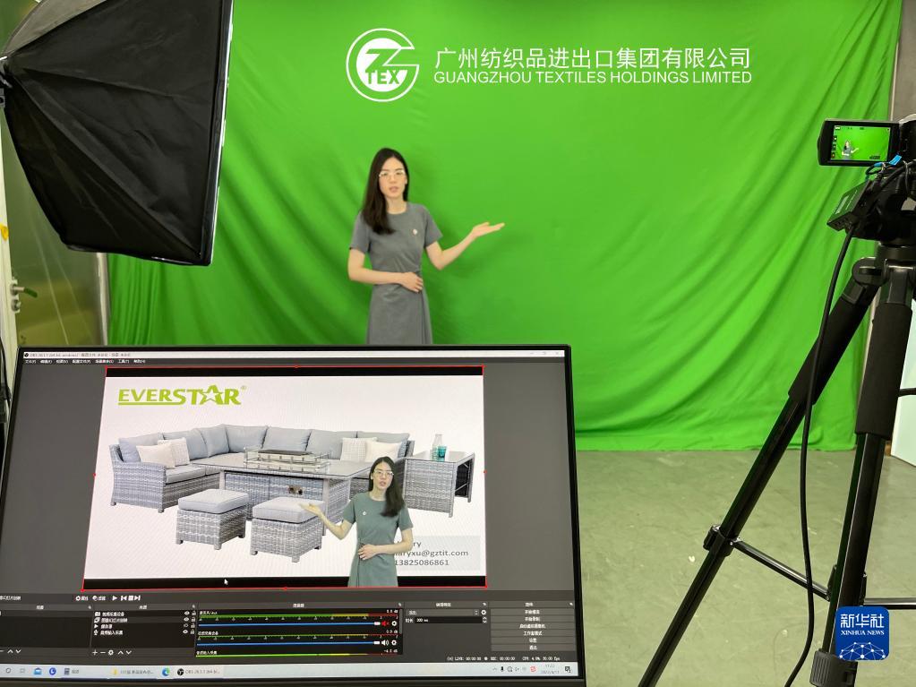 廣州輕工工貿(mào)集團(tuán)紡織品進(jìn)出口公司員工利用綠幕技術(shù)排練廣交會(huì)上“云展示”(4月11日攝)。新華社發(fā)(受訪者供圖)