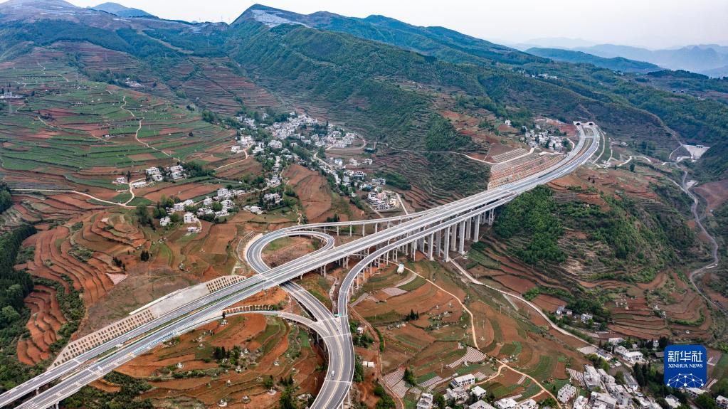 貴州赫(赫章)六(六盤(pán)水)高速公路汪家寨互通(4月21日攝,無(wú)人機(jī)照片)。新華社記者 陶亮 攝