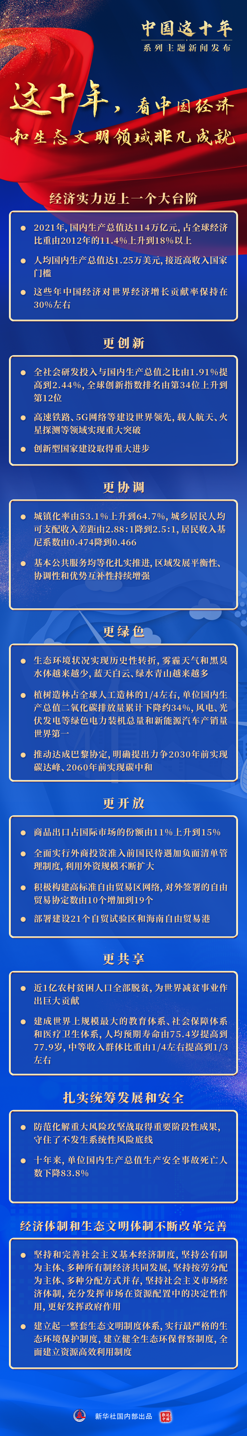 這是我國經濟實力又邁上一個大臺階的十年,這是扎實推進創(chuàng)新發(fā)展、協(xié)調發(fā)展、綠色發(fā)展、開放發(fā)展、共享發(fā)展的十年,這是扎實統(tǒng)籌發(fā)展和安全的十年,這是經濟體制和生態(tài)文明體制不斷改革完善的十年……