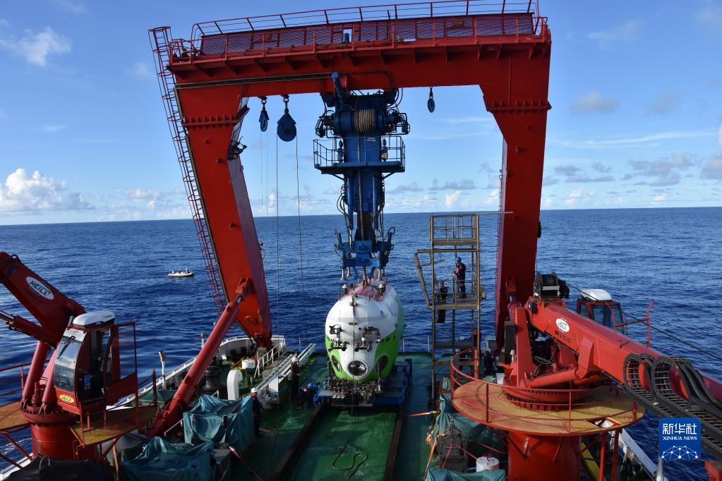 2021年8月18日,工作人員在西太平洋準(zhǔn)備從“探索一號”科考船甲板布放“奮斗者”號。新華社記者 陳凱姿 攝
