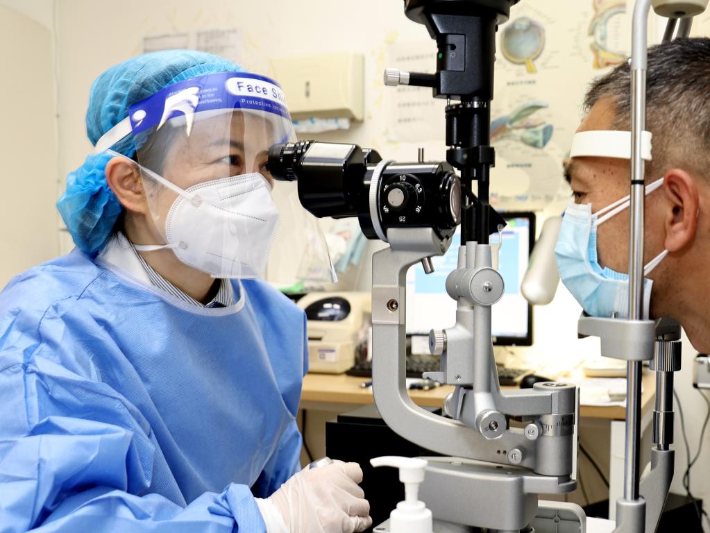 資料圖:上海市第十人民醫(yī)院眼科主任醫(yī)師鄒?。ㄗ螅榛颊邫z查。新華社記者 陳建力 攝
