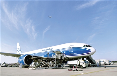 鄭州新鄭國際機(jī)場(chǎng)工作人員在為一架俄羅斯空橋貨運(yùn)航空公司貨機(jī)裝貨 新華社發(fā)