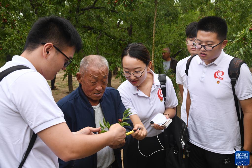 中國(guó)海洋大學(xué)紅旗智援博士團(tuán)成員在山東省樂陵市朱集鎮(zhèn)大常村棗林向果農(nóng)了解果樹種植情況(2019年9月19日攝)。新華社記者 李紫恒 攝