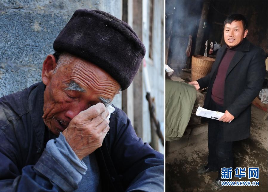 拼版照片:左圖為2019年10月1日,貴州省銅仁市沿河土家族自治縣中寨鎮(zhèn)大坪村村民張信龍談起文偉紅時(shí)傷心落淚(新華社記者胡星攝);右圖為2018年12月27日,文偉紅在沿河土家族自治縣中寨鎮(zhèn)大坪村村民家中走訪。新華社發(fā)