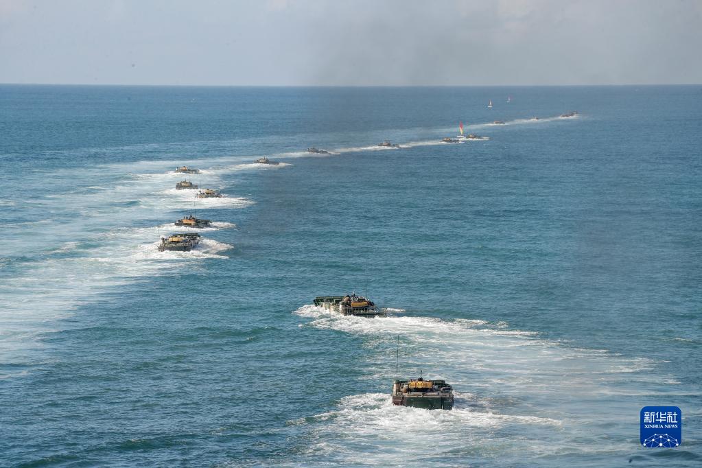 陸軍第74集團(tuán)軍某合成旅兩棲裝甲車進(jìn)行海上泛水編波訓(xùn)練(2020年8月14日攝)。新華社發(fā)(李彬 攝)