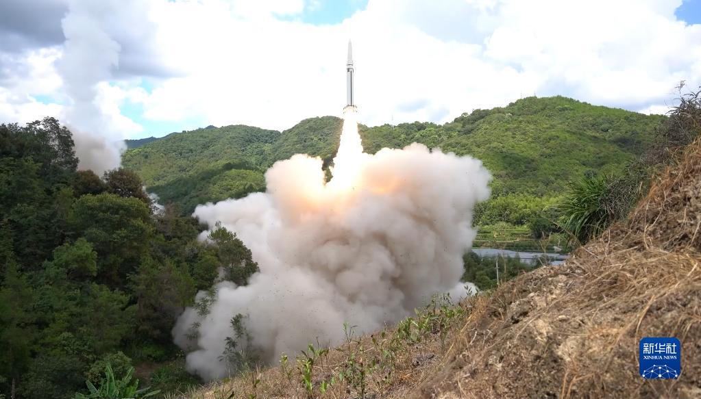 東部戰(zhàn)區(qū)火箭軍對(duì)臺(tái)島東部外海預(yù)定海域?qū)嵤┗鹆ν粨?。這是導(dǎo)彈發(fā)射升空(2022年8月4日,視頻截圖)。新華社發(fā)