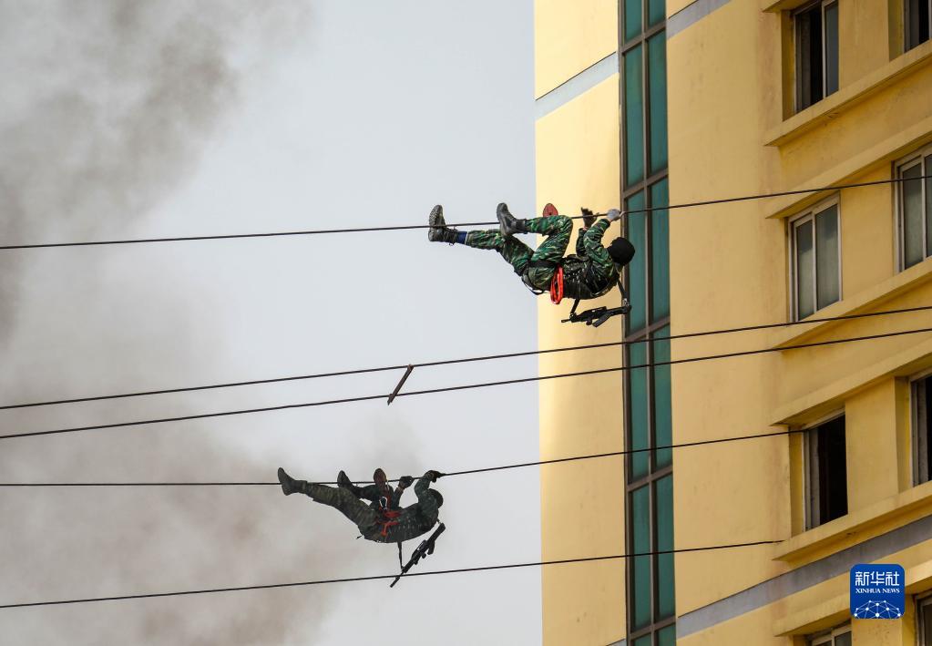在模擬反恐演練中,武警獵鷹突擊隊(duì)特戰(zhàn)隊(duì)員利用鐵索接近被“恐怖分子”占據(jù)的樓房(2019年4月4日攝)。新華社發(fā)(楊志毅 攝)