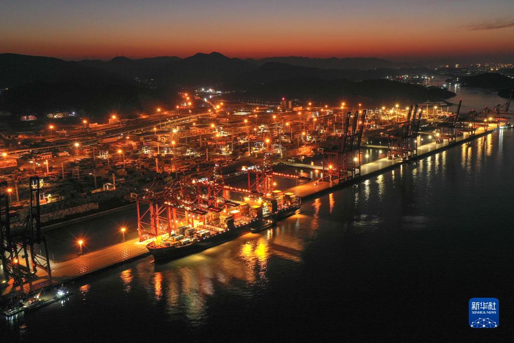 夜幕下,一艘貨輪停靠在寧波舟山港穿山港區(qū)集裝箱碼頭(2023年1月31日攝,無人機照片)。2022年寧波舟山港完成年貨物吞吐量超12.5億噸,連續(xù)14年位居全球第一;完成集裝箱吞吐量3335萬標準箱,位居全球第三。新華社記者 黃宗治 攝