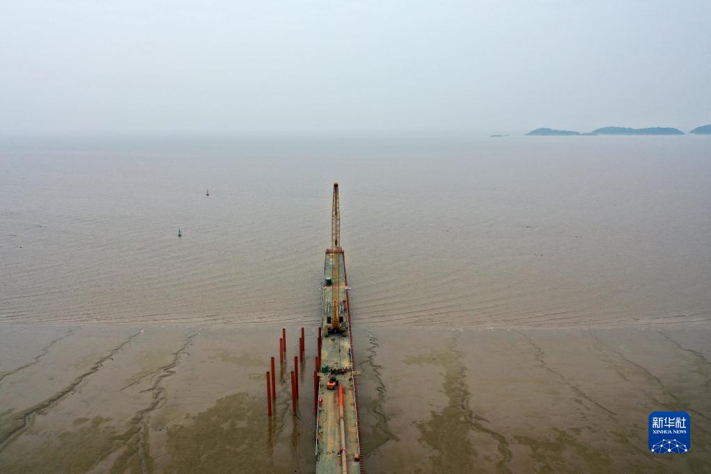 工程人員在通蘇嘉甬高鐵杭州灣跨海鐵路大橋施工現(xiàn)場鋪設(shè)棧橋,為后期工程做準備(2023年2月1日攝,無人機照片)。2022年11月30日開工建設(shè)的通蘇嘉甬高鐵杭州灣跨海鐵路大橋全程跨海,總長約29.2公里,為設(shè)計時速350公里的雙線高速鐵路橋,是目前世界上在建長度最長、建設(shè)標準最高的高速鐵路跨海大橋。新華社記者 黃宗治 攝