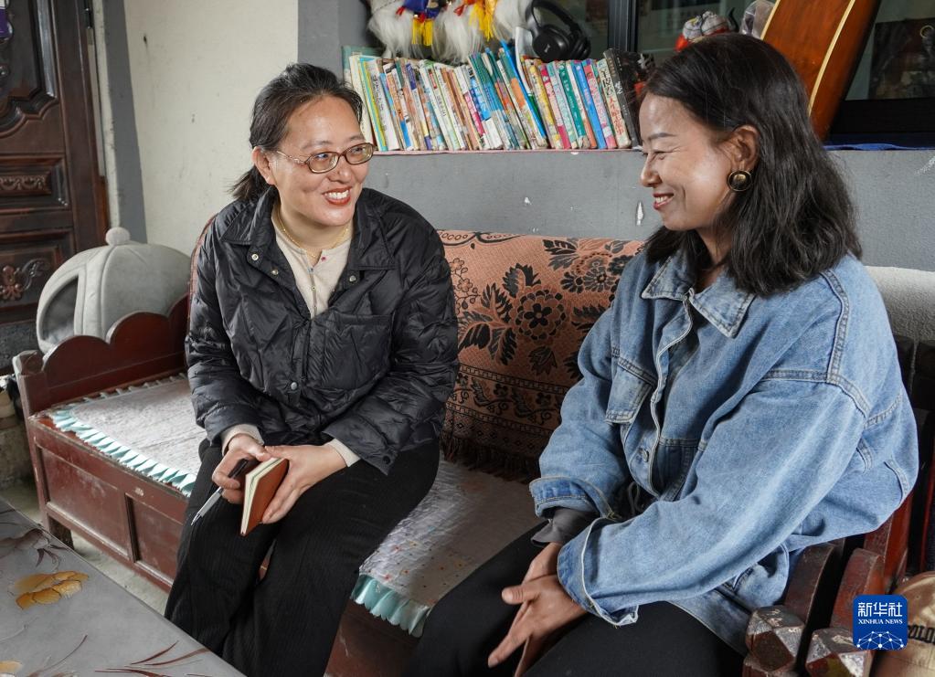 在西藏墨脫縣德興鄉(xiāng)德興村,白瑪曲珍(左)在村民格桑曲珍家了解手工藝品制作和銷(xiāo)路情況(2月19日攝)。新華社記者 王澤昊 攝
