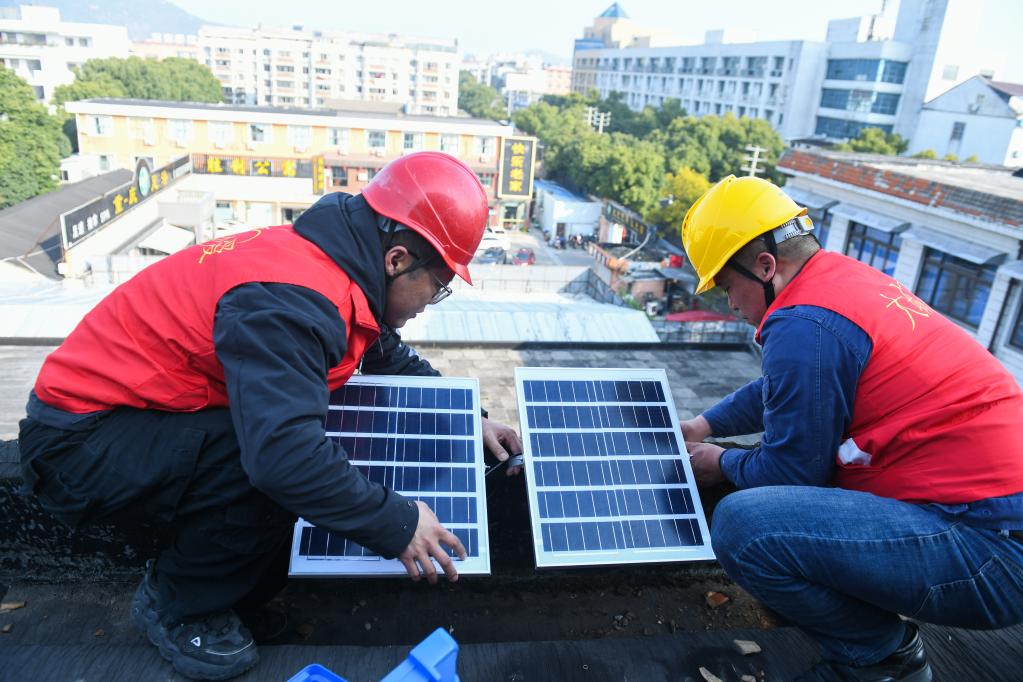 2023年2月20日,浙江余姚市大城小愛(ài)公益服務(wù)中心的志愿者為老舊小區(qū)安裝光伏發(fā)電板。新華社記者徐昱 攝