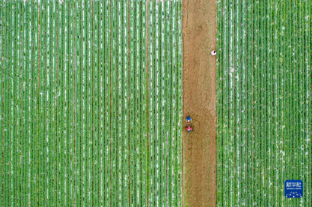 在四川省閬中市彭城鎮(zhèn),村民駕駛農(nóng)機(jī)翻耕菜地(2月23日攝,無人機(jī)照片)。新華社發(fā)(王玉貴 攝)