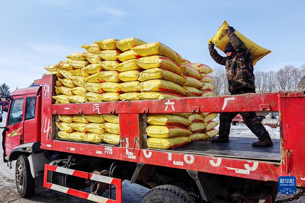 北大荒集團(tuán)五大連池農(nóng)場科技服務(wù)中心工人在裝運肥料(2月16日攝)。新華社發(fā)(陸文祥 攝)