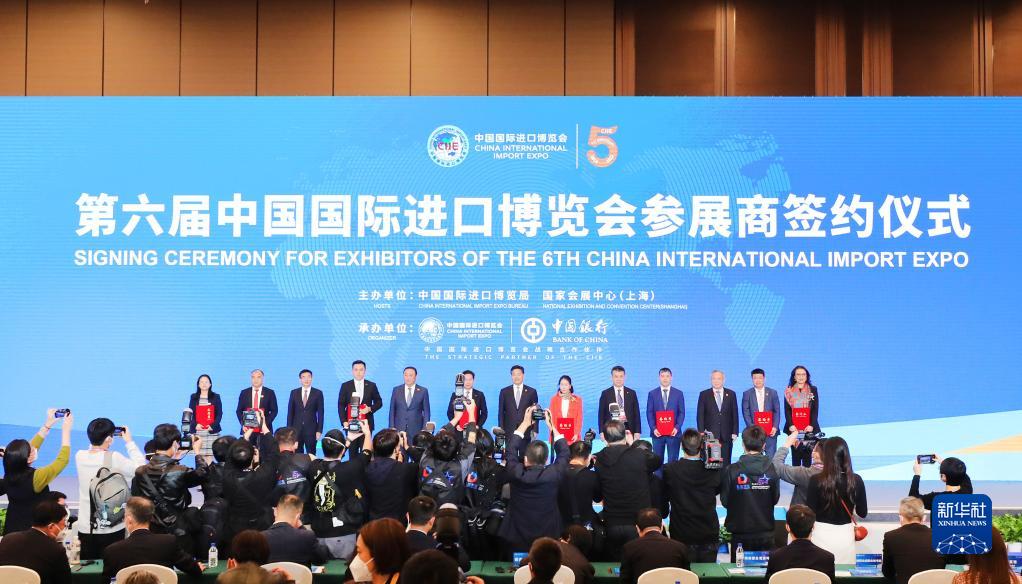2022年11月6日,2022年中國國際進(jìn)口博覽會參展商聯(lián)盟大會在上海舉行。這是在大會期間進(jìn)行的第六屆進(jìn)博會參展商簽約儀式。新華社記者 方喆 攝
