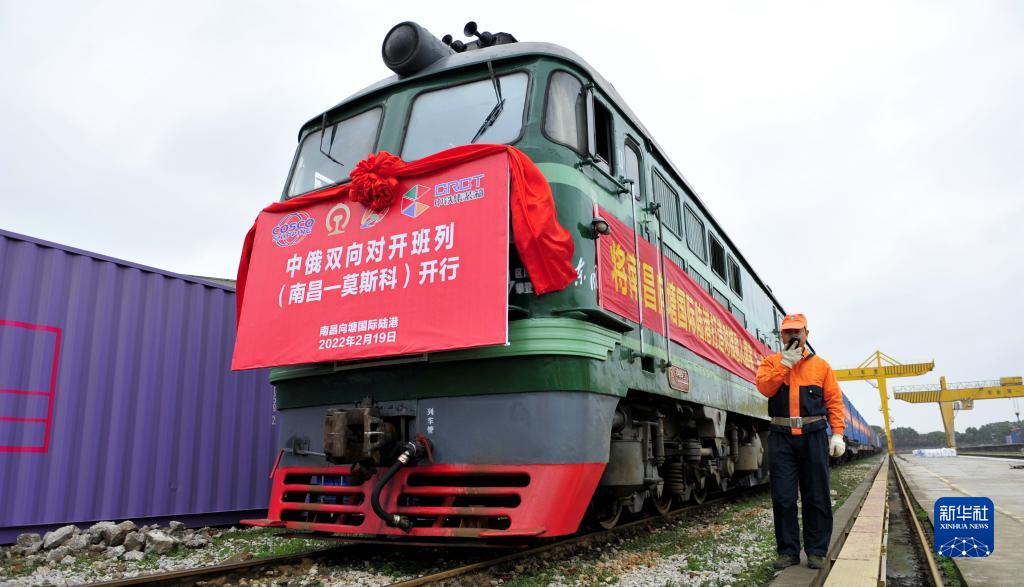 2022年江西首列中俄雙向?qū)﹂_班列(南昌—莫斯科)在南昌向塘國際陸港準(zhǔn)備出發(fā)(2022年2月19日攝)。新華社記者 彭昭之 攝