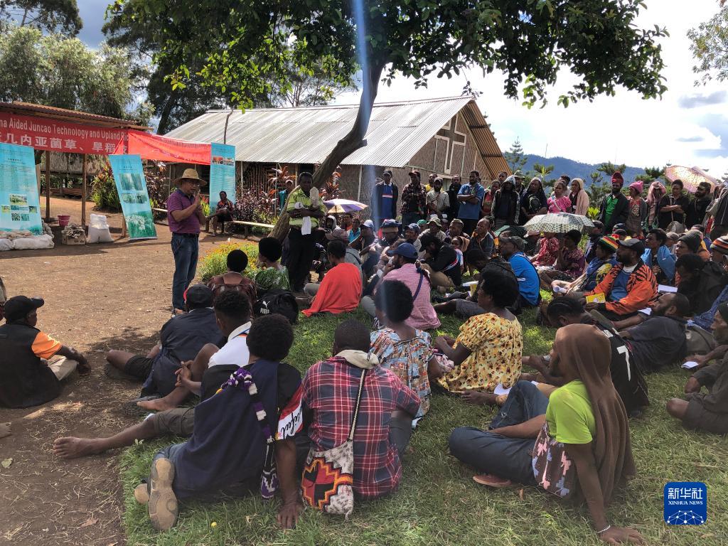 中國援巴布亞新幾內(nèi)亞菌草旱稻項(xiàng)目專家組組長林應(yīng)興(戴草帽者)在巴布亞新幾內(nèi)亞東高地省中國援助巴新菌草和旱稻技術(shù)項(xiàng)目第9期培訓(xùn)班上授課(2020年12月15日攝)。新華社發(fā)