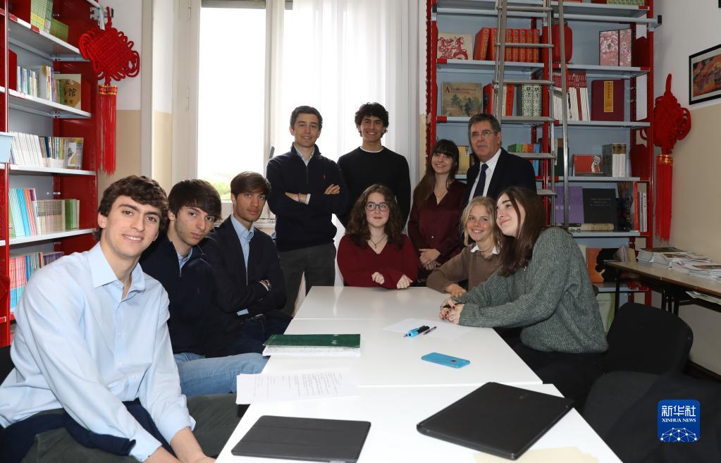 意大利羅馬國立住讀學(xué)校校長雷亞萊(后排右一)與致信習(xí)近平主席的學(xué)生們?cè)谝黄穑?019年3月18日攝)。新華社記者 程婷婷 攝