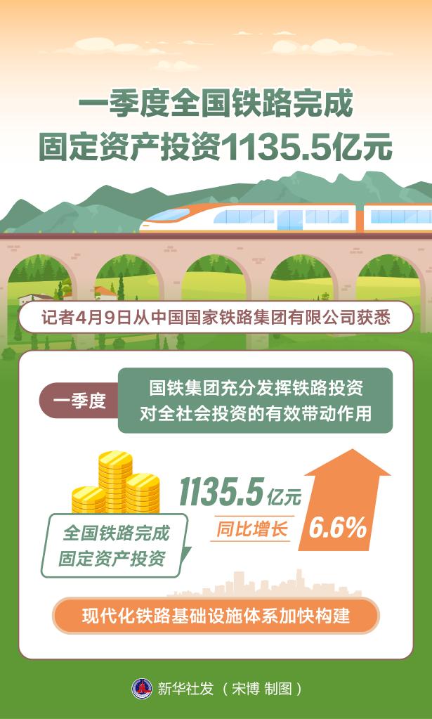 ?? 新華社北京4月9日電(記者樊曦)記者9日從中國國家鐵路集團有限公司獲悉,一季度,國鐵集團充分發(fā)揮鐵路投資對全社會投資的有效帶動作用,全國鐵路完成固定資產(chǎn)投資1135.5億元、同比增長6.6%,現(xiàn)代化鐵路基礎(chǔ)設(shè)施體系加快構(gòu)建。