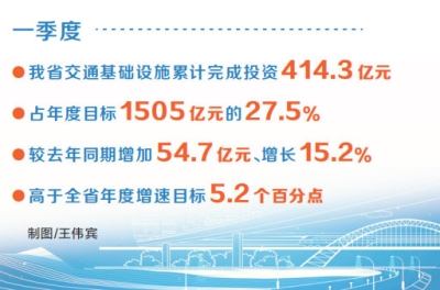這是我省全力推動交通重點項目建設加速提質(zhì)增效的一個縮影。記者從當天召開的河南省交通運輸經(jīng)濟運行調(diào)度會上獲悉,今年一季度,我省交通基礎設施累計完成投資414.3億元,占年度目標1505億元的27.5%,較去年同期增加54.7億元、增長15.2%,高于全省年度增速目標5.2個百分點。