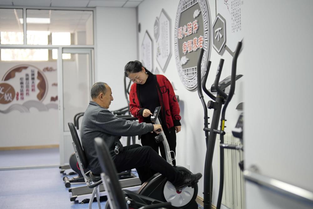 2023年4月16日,老年人在唐山市豐南區(qū)胥各莊鎮(zhèn)一處社區(qū)養(yǎng)老服務中心內(nèi)健身。新華社記者 牟宇 攝