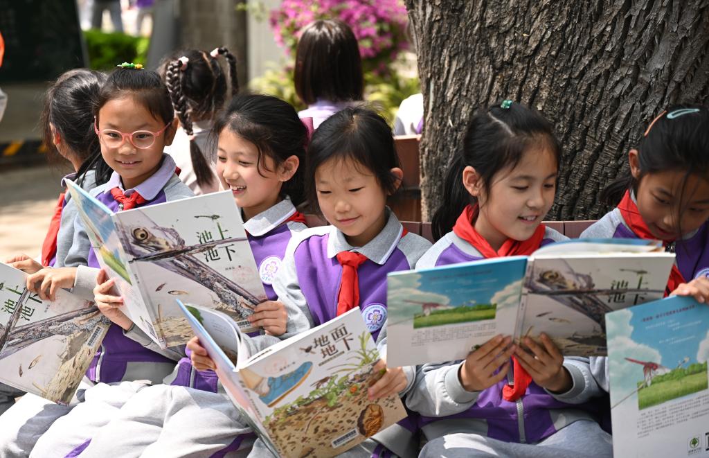 在她的校園里,有一棵“長(zhǎng)滿書(shū)的大樹(shù)”,掛滿了《神筆馬良》《西游記》《可愛(ài)的中國(guó)》等經(jīng)典書(shū)籍。教學(xué)樓走廊里、教室里,隨處可見(jiàn)各種圖書(shū)。踏著閱讀的階梯,祖國(guó)的花朵茁壯成長(zhǎng)。