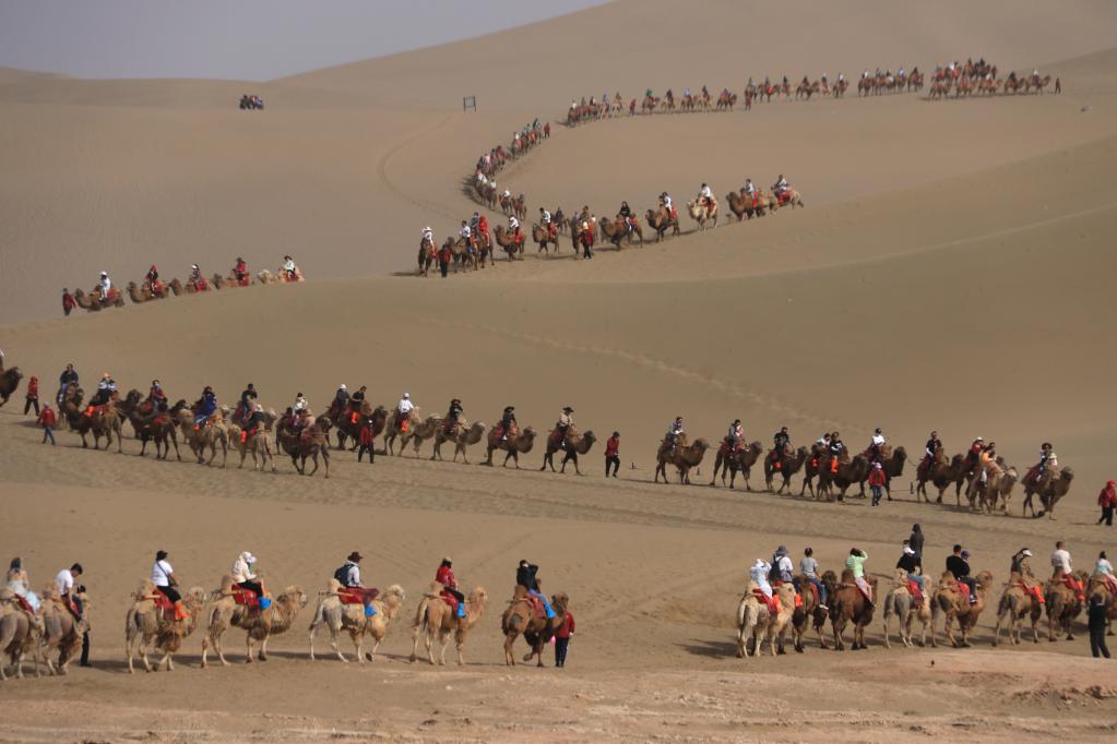“2400多峰駱駝全部‘上崗’,從早到晚忙不過(guò)來(lái)!原本40分鐘的路程現(xiàn)在要走1小時(shí)左右?!倍鼗网Q沙山月牙泉景區(qū)負(fù)責(zé)人說(shuō)。