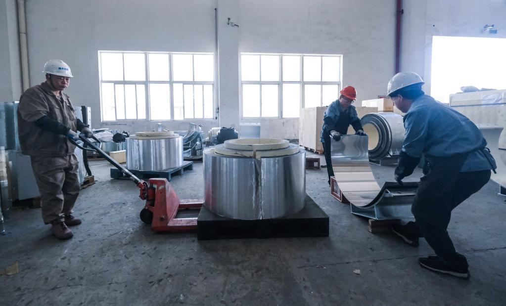 5月2日,在位于浙江省嘉興市秀洲區(qū)王店鎮(zhèn)的浙江振申絕熱科技股份有限公司聚氨酯車間內(nèi),工人進(jìn)行管托安裝工序。新華社記者 徐昱 攝