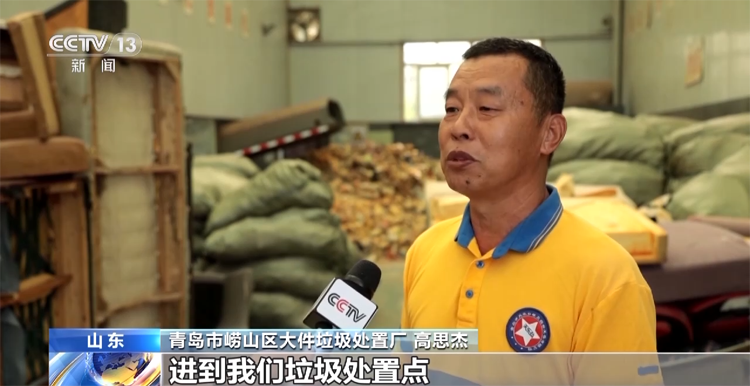 青島市嶗山區(qū)大件垃圾處置廠 高思杰:大件垃圾、沙發(fā)家具什么的,進到我們垃圾處置點,通過人工分揀,再通過設(shè)備的粉碎。粉碎完了以后,木頭我們揀出來做再利用,海綿和布再送到垃圾轉(zhuǎn)運站去,做無害化處理。