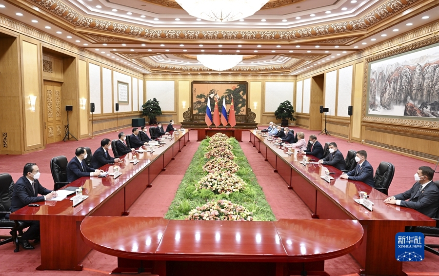 習近平指出,在雙方共同努力下,中俄關系始終保持健康穩(wěn)定發(fā)展勢頭,各領域合作穩(wěn)步推進,兩國世代友好的社會基礎和民意基礎更加牢固。今年3月,我對俄羅斯進行國事訪問,同普京總統(tǒng)就深化兩國全面戰(zhàn)略協(xié)作和各領域務實合作達成新的重要共識。發(fā)展中俄關系是兩國基于各自國家和人民根本利益作出的戰(zhàn)略選擇。中方愿繼續(xù)同俄方一道,發(fā)展守望相助、深度融通、開拓創(chuàng)新、普惠共贏的新時代全面戰(zhàn)略協(xié)作伙伴關系,助力兩國發(fā)展振興,推動建設繁榮穩(wěn)定、公平公正的世界。