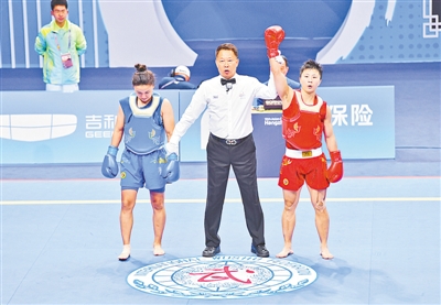 ??李玥瑤(紅)在散打女子52公斤級(jí)半決賽中,以12分優(yōu)勢戰(zhàn)勝藍(lán)方哈薩克斯坦選手,順利進(jìn)入決賽。 本報(bào)記者 李焱 攝