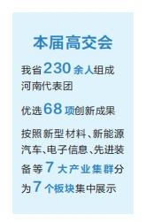 本屆高交會以“激發(fā)創(chuàng)新活力 提升發(fā)展質(zhì)量”為主題,是史上規(guī)模最大、參與國家和地區(qū)最多的一屆高交會。作為高交會的“老朋友”,省商務(wù)廳組織230余人組成河南代表團(tuán),在全省優(yōu)選了68項(xiàng)創(chuàng)新成果,按照新型材料、新能源汽車、電子信息、先進(jìn)裝備、現(xiàn)代食品、現(xiàn)代輕紡、現(xiàn)代醫(yī)藥等7大產(chǎn)業(yè)集群分為7個(gè)板塊集中展示,并攜旭陽光電、超聚變、力量鉆石、綠纖股份、未來星機(jī)器人等16家企業(yè)亮相。