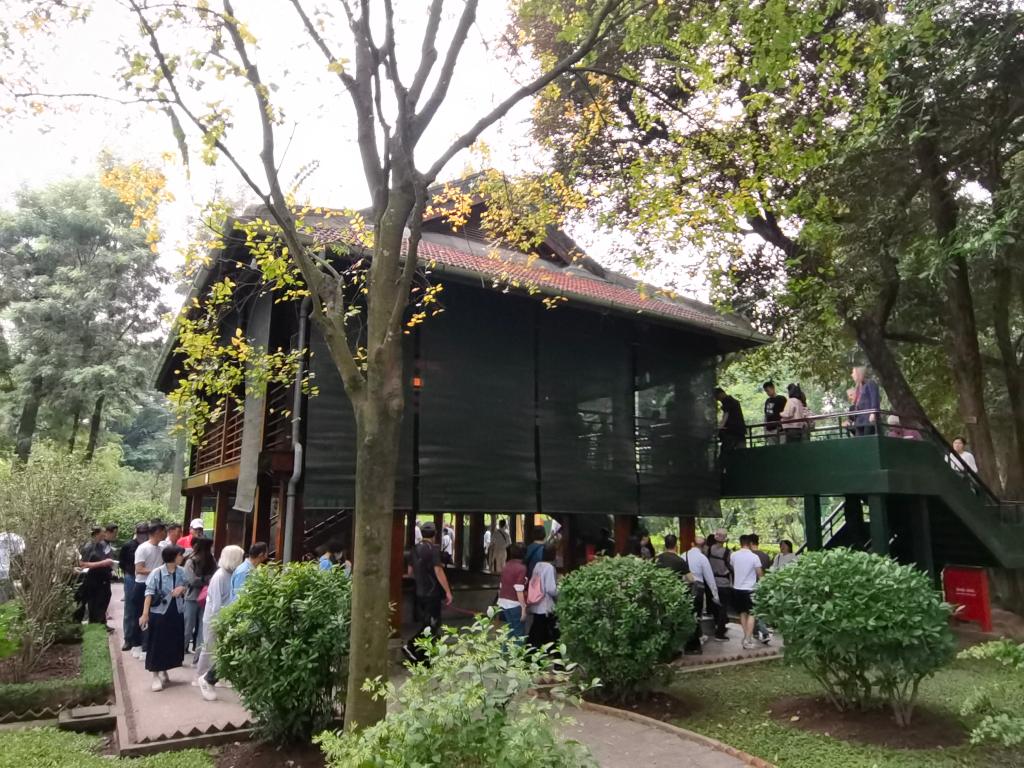在河內(nèi)地標(biāo)巴亭廣場(chǎng)一側(cè),坐落著胡志明陵和胡志明故居。記者抵達(dá)廣場(chǎng)時(shí),守衛(wèi)胡志明陵的儀仗兵正在舉行換崗儀式,眾多民眾和游客高舉相機(jī)或手機(jī),記錄下這莊嚴(yán)肅穆的一刻。胡志明陵北側(cè)的胡志明故居內(nèi),各國(guó)游客排起長(zhǎng)隊(duì),在他曾長(zhǎng)期居住和工作的高腳屋下駐足留影。