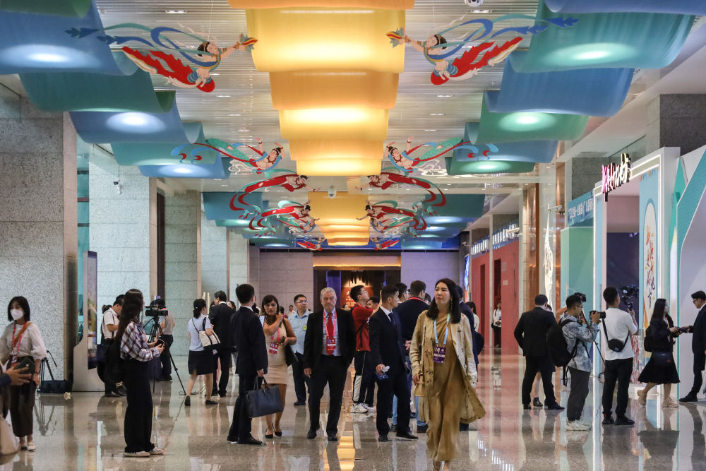2023年9月6日,與會(huì)嘉賓在第六屆絲綢之路(敦煌)國(guó)際文化博覽會(huì)上參觀。新華社記者 馬希平 攝