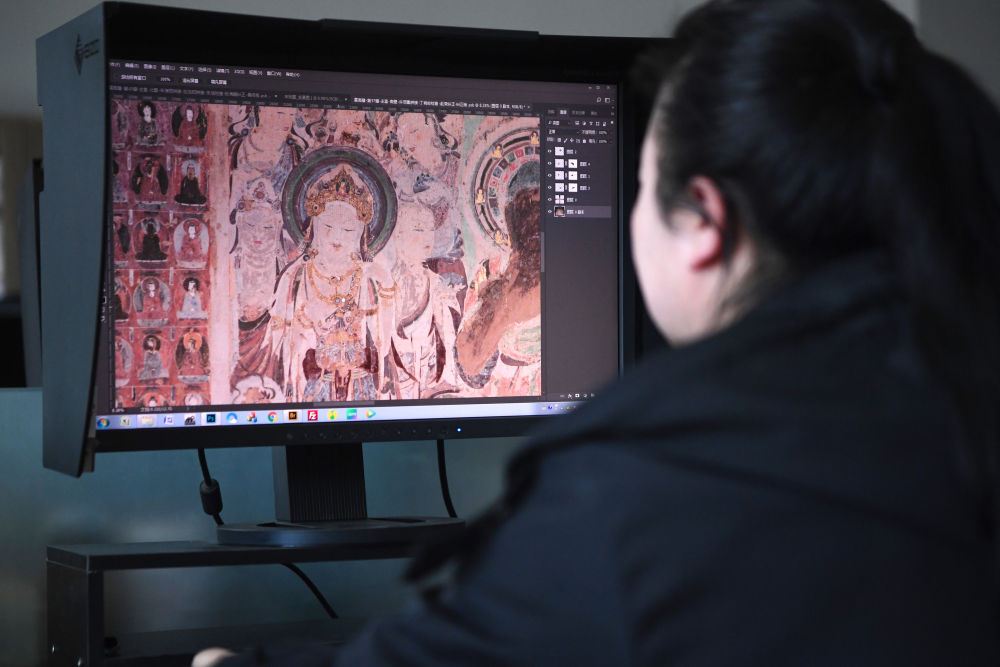 敦煌研究院文物數(shù)字化保護(hù)團(tuán)隊(duì)圖像處理人員年海麗在拼接壁畫(huà)圖像(2023年4月25日攝)。新華社記者 陳斌 攝