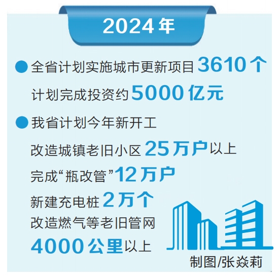 聚焦群眾“急難愁盼”等突出問題,我省堅持項目為王,科學(xué)謀劃實施城市更新項目。針對“一主兩副”重點城市和城市生命線安全工程、老舊小區(qū)改造、地下管網(wǎng)改造等重點領(lǐng)域,完善城市更新項目庫,強(qiáng)化項目監(jiān)測調(diào)度,穩(wěn)步推動項目落地見效。我省計劃今年新開工改造城鎮(zhèn)老舊小區(qū)25萬戶以上、完成“瓶改管”12萬戶、新建充電樁2萬個,改造燃?xì)獾壤吓f管網(wǎng)4000公里以上。