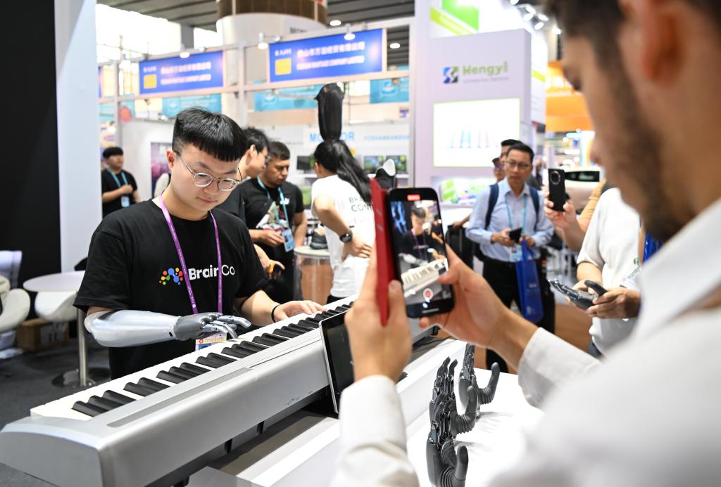 ??4月17日,佩戴智能仿生手的參展商工作人員在第135屆廣交會第一期“智慧生活”專區(qū)強(qiáng)腦科技展臺演奏電子琴。新華社記者 鄧華 攝