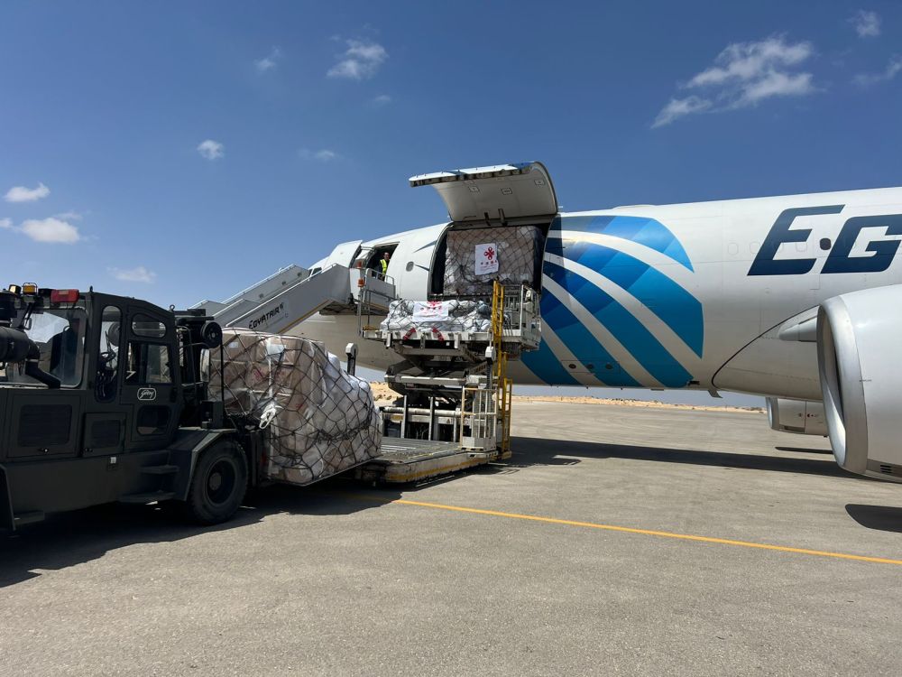 2024年4月19日,工作人員在埃及阿里什機(jī)場(chǎng)卸載中國(guó)援助巴勒斯坦的物資。新華社發(fā)