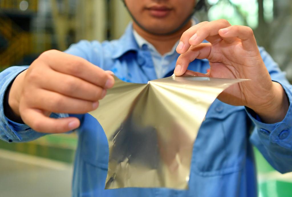 ??在位于山西的太鋼集團,員工展示用手撕開0.02毫米厚的超薄帶狀不銹鋼(2019年5月24日攝)。新華社記者 曹陽 攝
