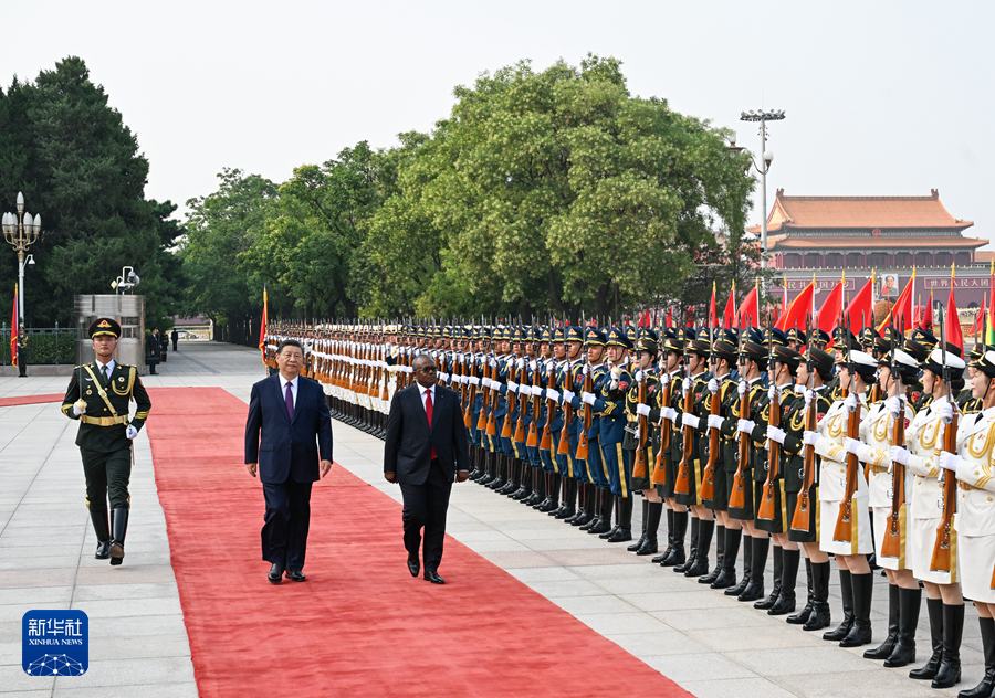 ??7月10日下午,國家主席習近平在北京人民大會堂同來華進行國事訪問的幾內(nèi)亞比紹總統(tǒng)恩巴洛舉行會談。這是會談前,習近平在人民大會堂東門外廣場為恩巴洛舉行歡迎儀式。新華社記者 饒愛民 攝