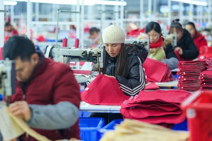??2024年1月18日,社區(qū)居民在紅安社區(qū)的鄉(xiāng)村振興就業(yè)車間工作。紅安社區(qū)是由易地搬遷安置區(qū)單獨(dú)成立的新社區(qū),位于湖南省湘西土家族苗族自治州鳳凰縣禾庫鎮(zhèn)。新華社記者 張鋮 攝