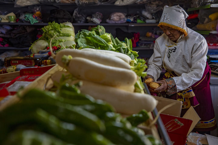 ??在西藏那曲市申扎縣馬躍鄉(xiāng)貝嘎四村偏遠(yuǎn)鄉(xiāng)鎮(zhèn)果蔬配送試點項目直銷點,店主西熱加措在整理供銷合作社配送來的新鮮蔬菜(2024年1月5日攝)。新華社記者 姜帆 攝